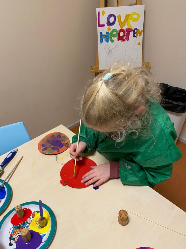 De kinderen vermaken zich ook weer prima op de bso. Mijn bink maakt iets van hout en mijn tuttebel is kerstballen aan het verven.