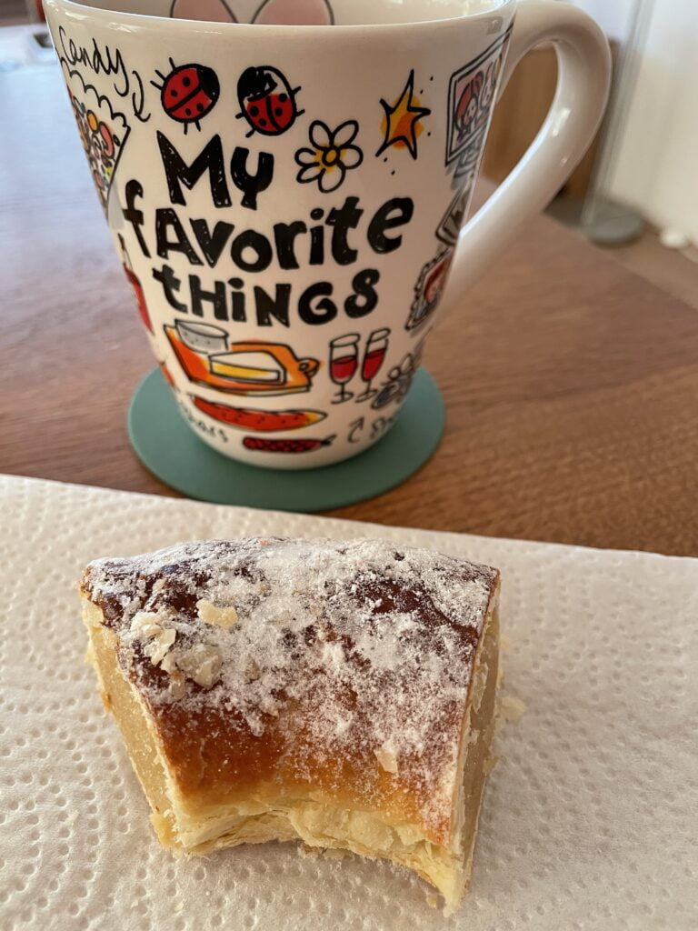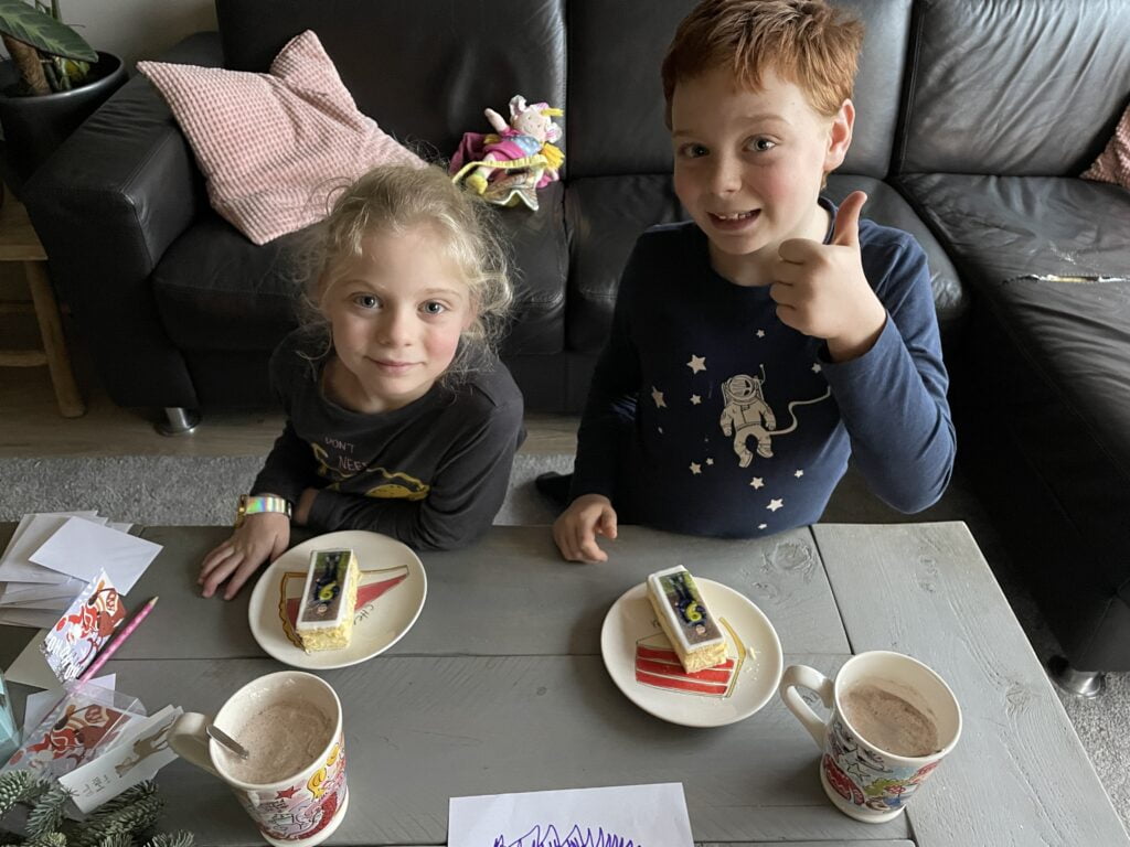 Ontbijten met tompouce en chocomel met slagroom, gewoon omdat het kan en omdat het zondag is. De kinderen worden er in ieder geval heel erg blij van.