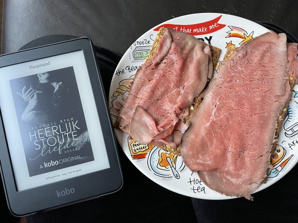 Verschil moet er zijn, want ik ontbijt met crackers met rosbief, terwijl ik nog even verder lees in mijn nieuwe Kobo Clara.