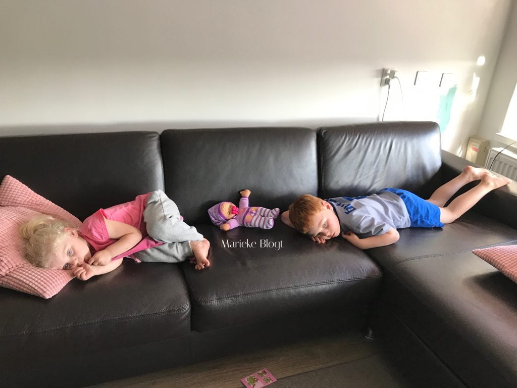Na het buitenspelen zijn ze versleten en liggen ze voor pampus op de bank.