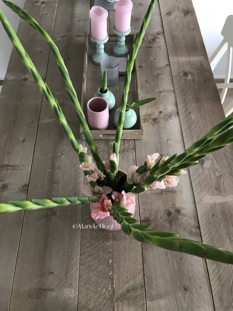 Eerder deze week zag ik ze al staan en nu was ik lief voor mezelf en nam ik een bos met roze gladiolen mee.