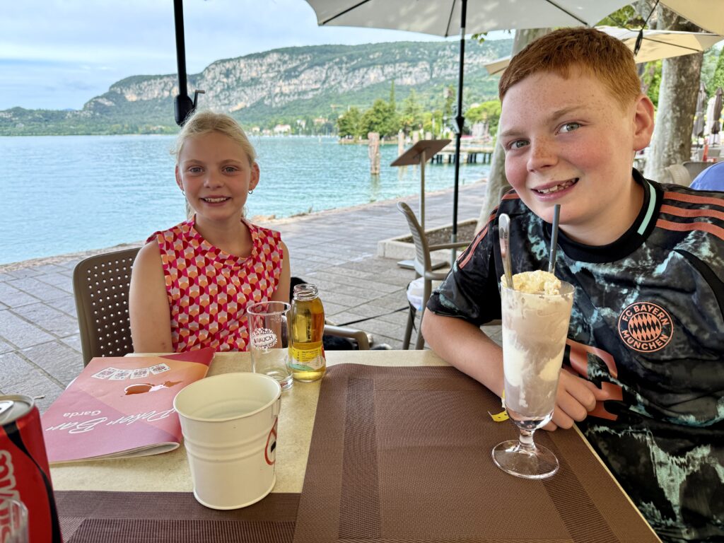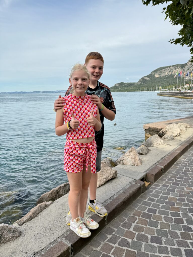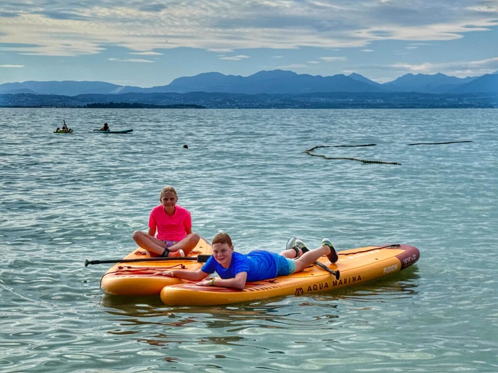 Vanmiddag zijn we naar het Gardameer gegaan en hebben we sups gehuurd, al hebben we daar wel anderhalf uur op moeten wachten. De kinderen hebben zich ondertussen prima vermaakt met de buurkinderen in het water. En zelfs ik ben het water in geweest. Voor wie mij kent weet dat ik liever niet in natuurwater ga, maar ja ik struikelde over een grote kei toen ik ging pootje baden en toen ging ik koppie onder. Daarna ook nog op de sup, dus vanaf nu durf ik tot aan het touw in het meer.