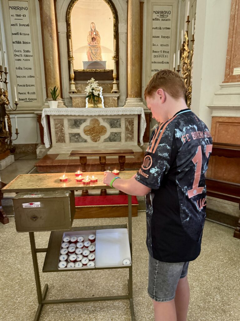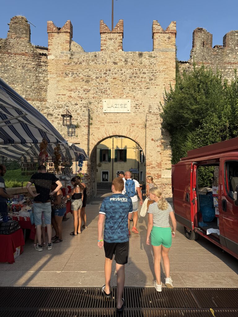 Om 08.17 lopen we richting de poort van Lazise. Het is er nog lekker rustig en dat is precies waarom we zo vroeg gaan. We struinen de hele markt af. Waar we normaal voetbalkleding kopen voor de gym, lopen we wel langs de kramen, maar kopen we er niks. Mijn puber heeft vanaf het nieuwe schooljaar gymkleding van school en voor de voetbal heeft hij nog genoeg tenues en mijn tiener haar tenues zijn nog prima voor de gym, helemaal nu ze van voetbal af is. Uiteindelijk kopen we alleen een badlaken voor mijn puber.