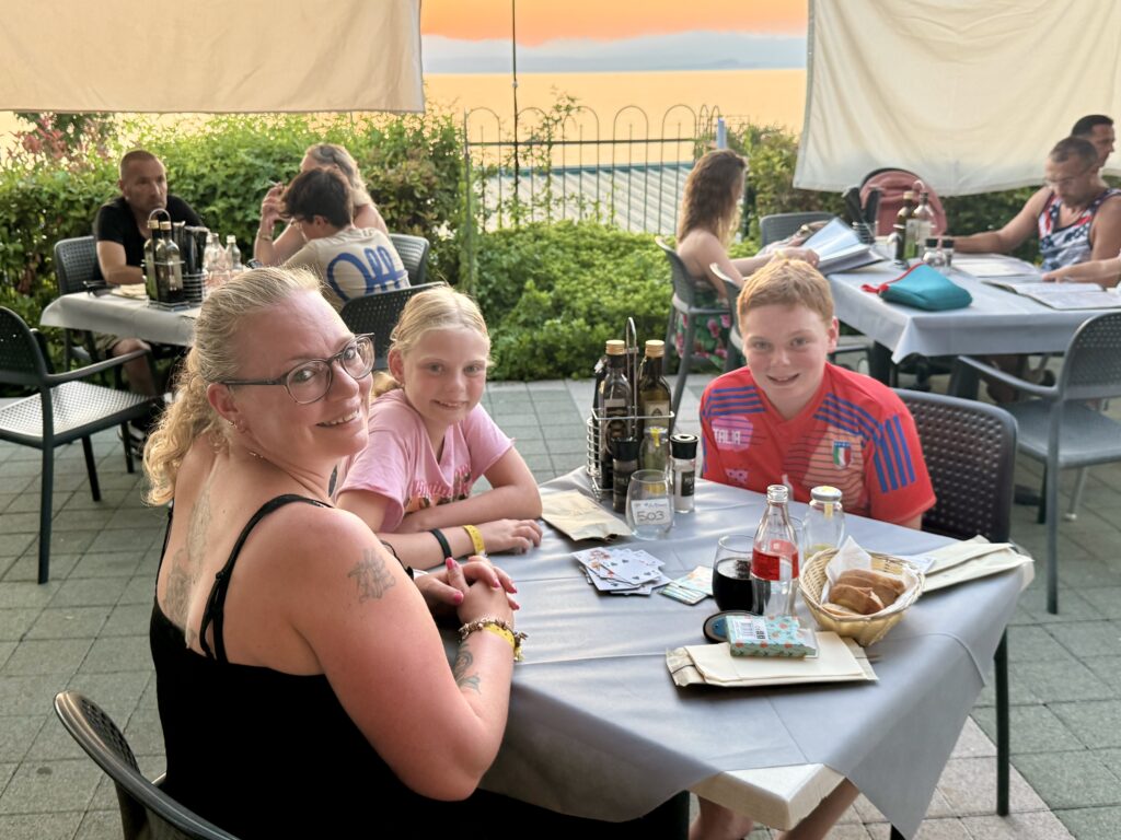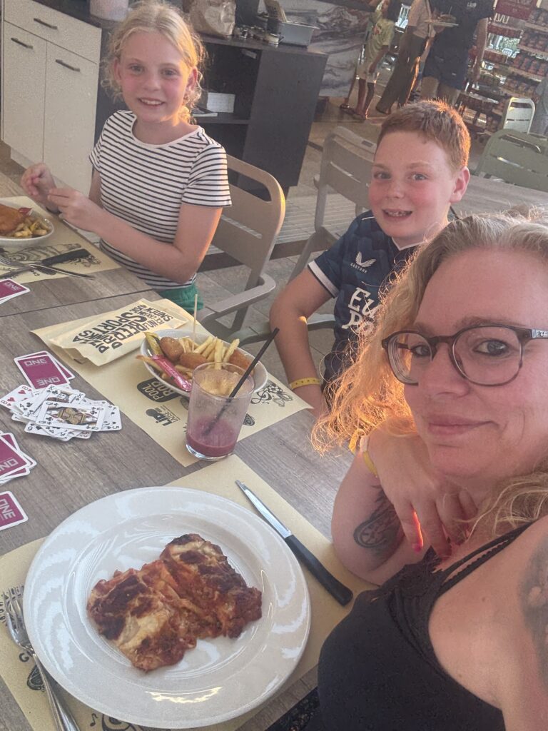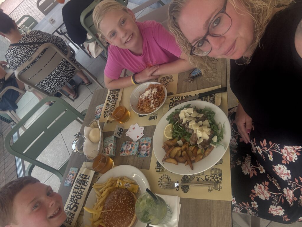 Terug op de camping ga ik meteen douchen, terwijl de kinderen nog even lekker chillen. Tegen achten gaan we naar de bar toe om een hapje te eten.