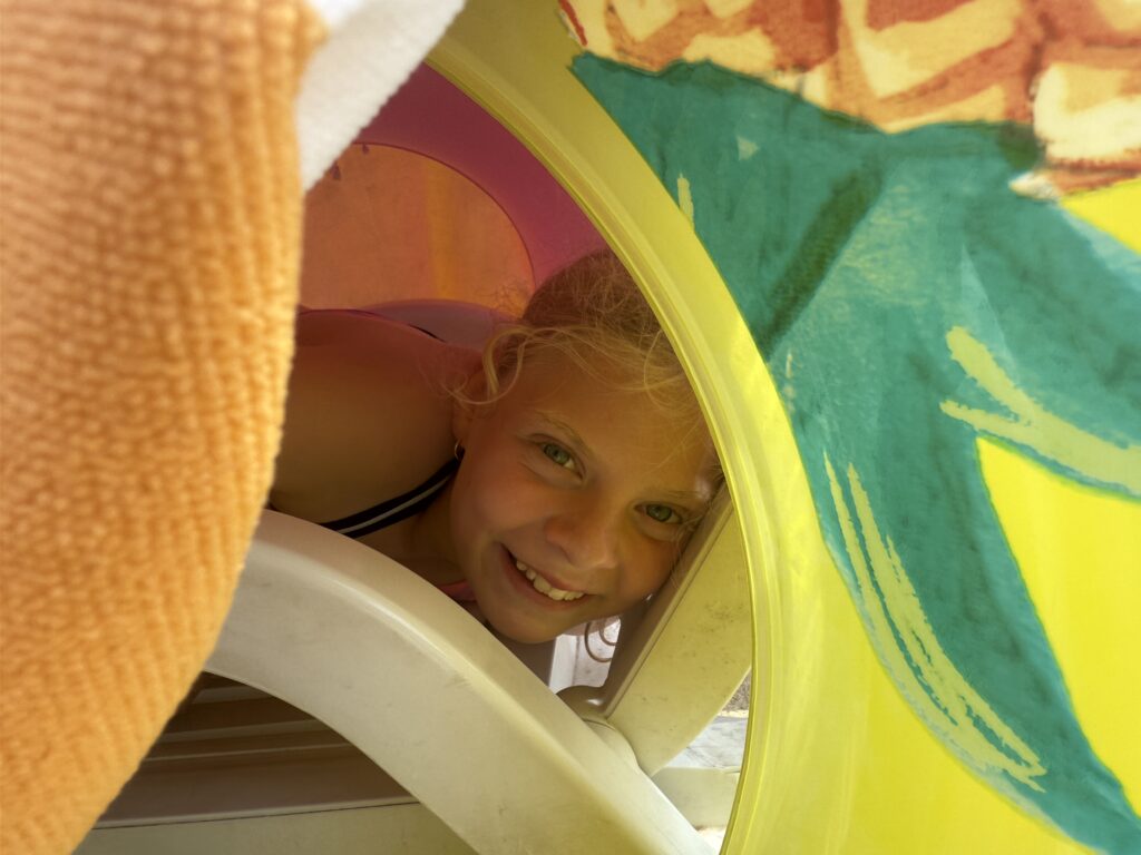 Terug op de camping eten we wat en daarna gaan we richting het zwembad, waar het echt heel rustig is, omdat het vrij bewolkt is en het aardig waait. Overigens is het alsnog 33 graden dus verder prima zwembadweer.