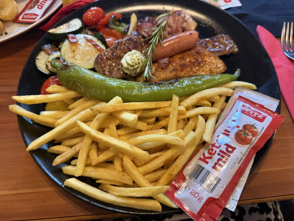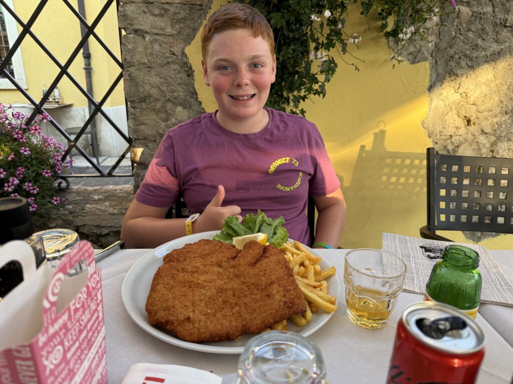 We besluiten ook een hapje te eten daar. Waar mijn tiener en ik niet heel veel krijgen, heeft mijn puber des te meer, aangezien hij een “normale” schnitzel heeft besteld.