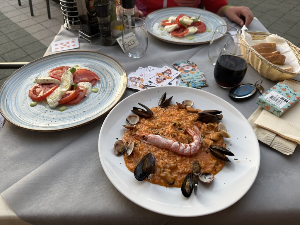 De kinderen eten er allebei caprese con mozzarella di bufala en ik heb een heerlijke risotto con frutti di mare. We nemen afscheid van de knappe Italiaan en gaan daarna terug naar boven.
