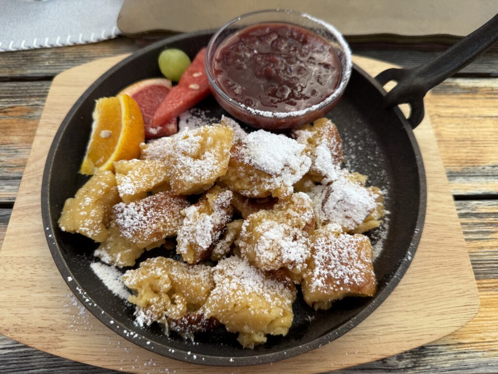 Als we daar wat hebben rondgelopen, gaan we bij Cervaso wat drinken en we besluiten er ook meteen te lunchen. Als we dan toch in Oostenrijk zijn, dan doen we het meteen goed en bestellen we allemaal kaiserschmarrn. En deze smaakt echt onwijs lekker.