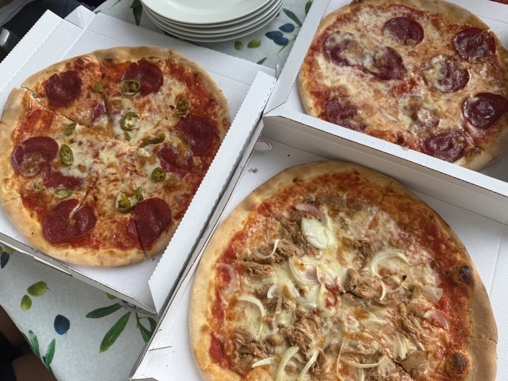 Thuis zijn we allemaal eigenlijk best wel kapot. De hitte doet toch ook wel wat zo. We gaan lekker chillen en om de beurt douchen. Eigenlijk zouden we uiteten gaan, maar daar hebben we echt de puf niet meer voor, dus halen we pizza’s en eten we die gezellig in de tuin op, waar het inmiddels heerlijk vertoeven is.