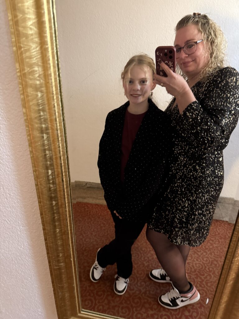 Ook de spiegelselfie mag vanavond niet ontbreken. Vandaag twinnen we alleen maar met onze schoenen, want ik krijg haar echt niet meer in een jurk, helaas.
