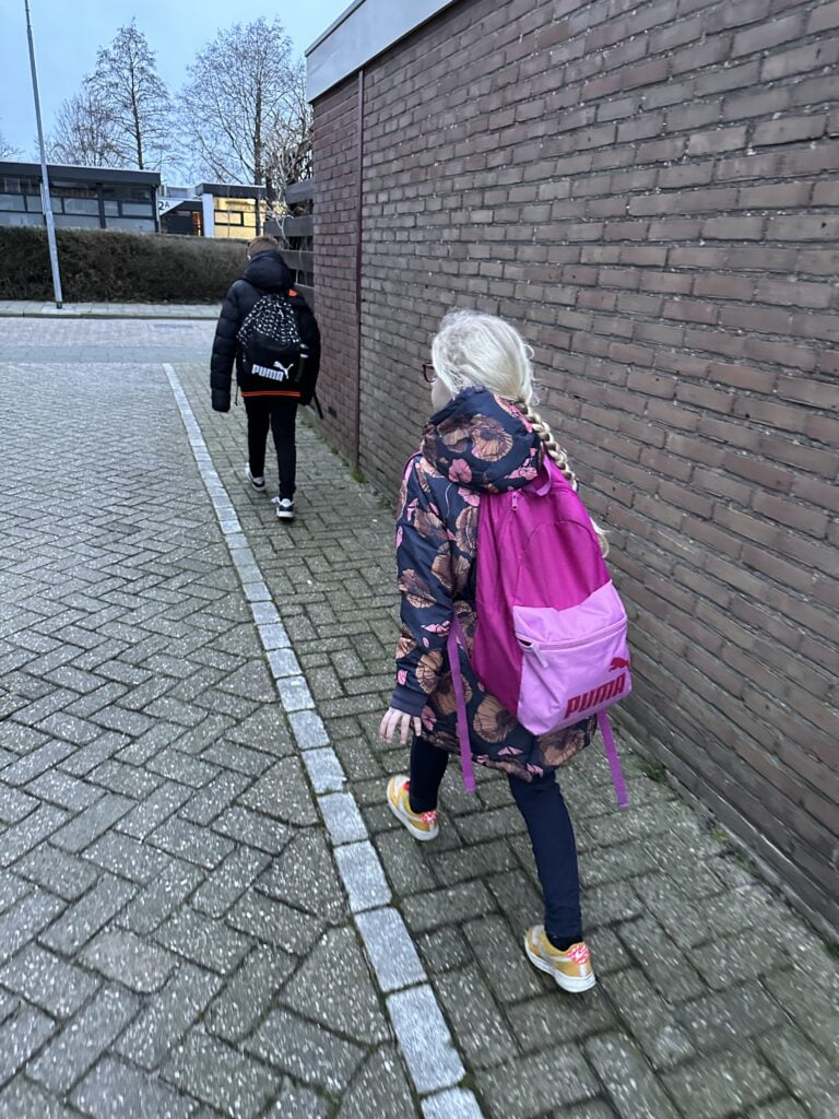 Het is weer tijd voor de schoolrun. Ik loop gezellig mee, zo kan ik meteen doorlopen naar de brievenbus en aansluitend naar de auto toe.