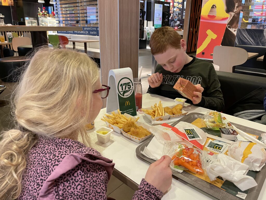 Vandaag moeten we ook nog even de deur uit. Voordat we weer naar huis gaan lunchen we gezellig bij de Mac, gewoon omdat het kan en omdat ik zin had in frietjes en we die aan de overkant niet meer halen, omdat ze er niet lekker meer zijn. Verder doen we de rest van de dag niks meer, want ik ben helemaal gesloopt en wil alleen nog maar op de bank hangen.