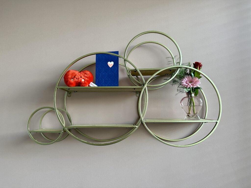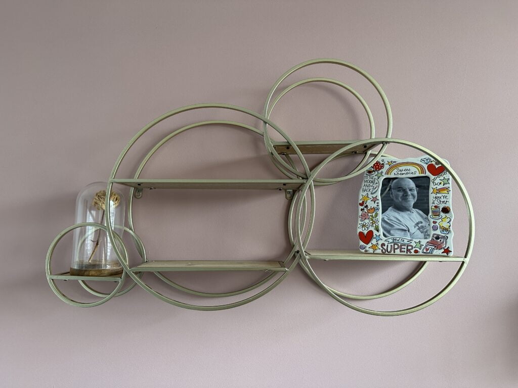 Waar het ene wandrek nu vol liefde staat, is het ander wandrek bedoeld om spullen op te zetten om aan Erik te kunnen denken. Voor nu heb ik onze favoriete foto van Erik alvast in een lijstje gedaan. En de roos in de stolp komt uit het rouwboeket van mijn broer wat op zijn kist heeft gelegen.