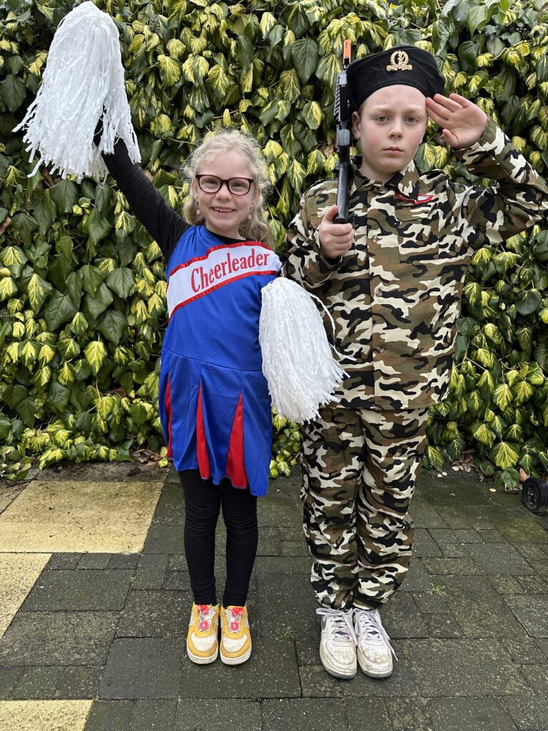 Alaaf! Het is eindelijk carnaval op school en vandaag mogen ze volledig verkleed naar school toe. Mijn tuttebel wil graag als cheerleader en mijn bink als militair. Ze nemen hun taak erg serieus zoals je kunt zien.