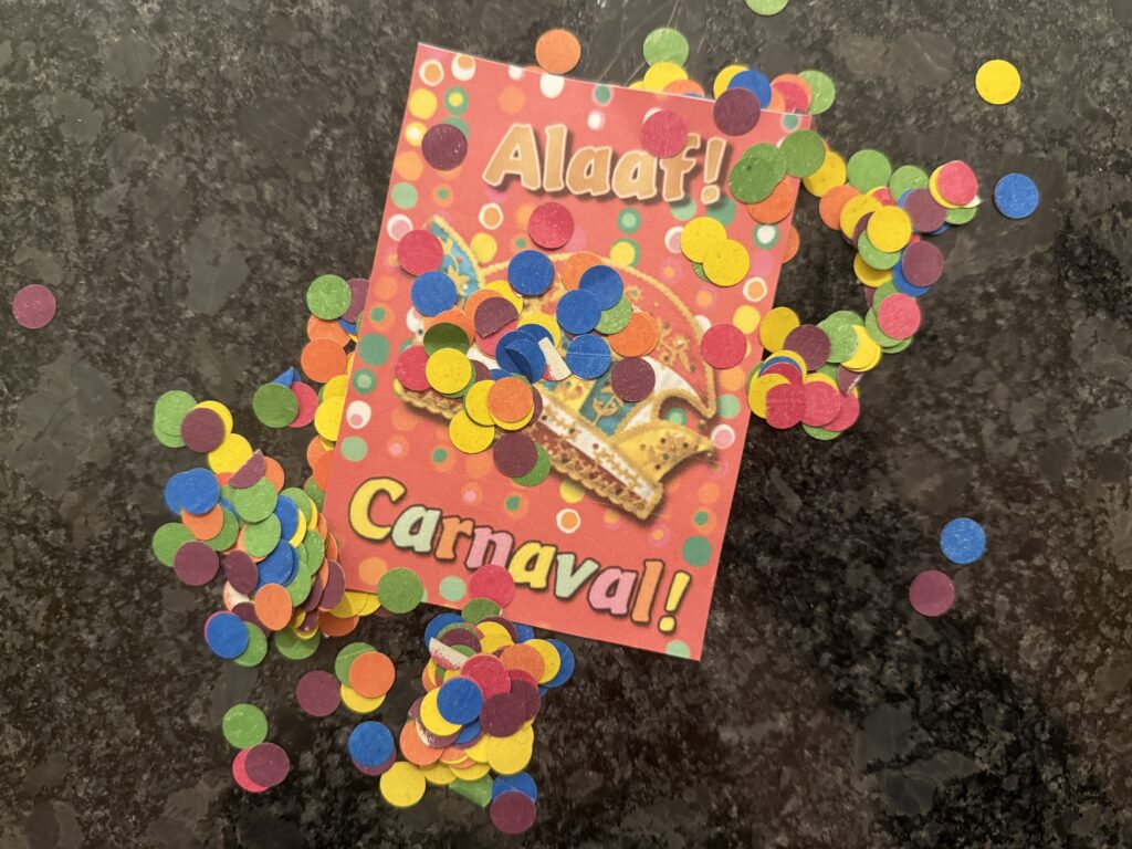 Als ik thuis kom ligt er een envelop in de brievenbus, het is een briefje voor de carnaval met lekker veel confetti. Gelukkig heb ik meteen door van wie het is en wat ik kan verwachten.