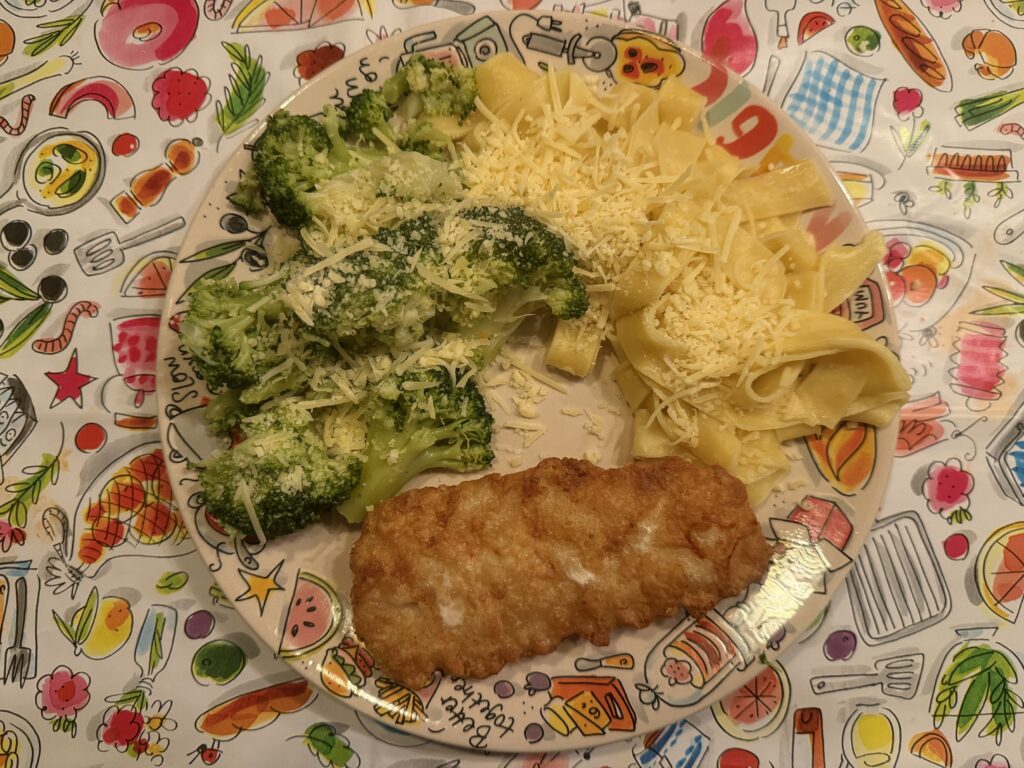 Voor het avondeten maak ik pasta, broccoli en vis klaar. Het smaakt echt heerlijk.