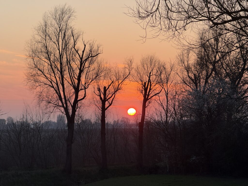 Mijn tiener en ik gaan na het eten tanken, want vanmorgen heb ik getankt in ons dorp en daar ben ik echt geschrokken van de prijs. Dus we rijden samen even naar België toe. Onderweg maakt mijn tiener deze foto van de zonsondergang.
