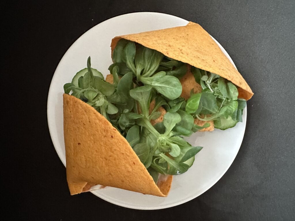 Voor de lunch maak ik paprika chili tortilla’s klaar met sla, komkommer, rookvlees en wat zero mayonaise.