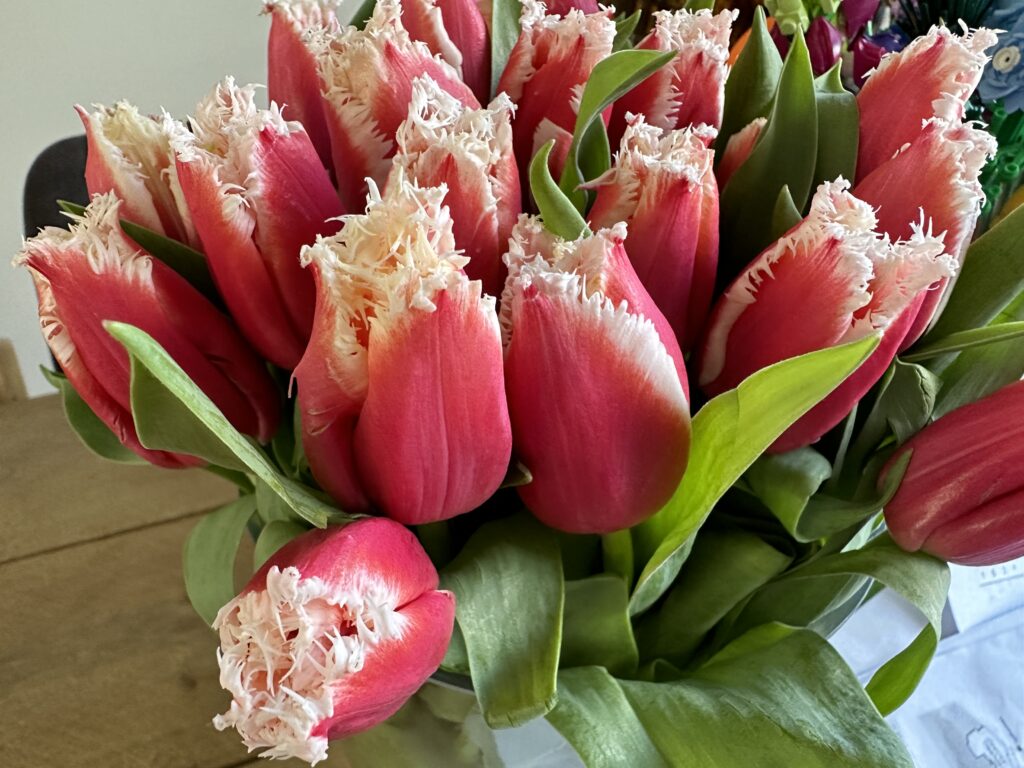 Ik trakteer mezelf op deze mooie bos tulpen. Normaal kocht Erik altijd tulpen voor me, dat is ook weer zoiets wat ik mis.