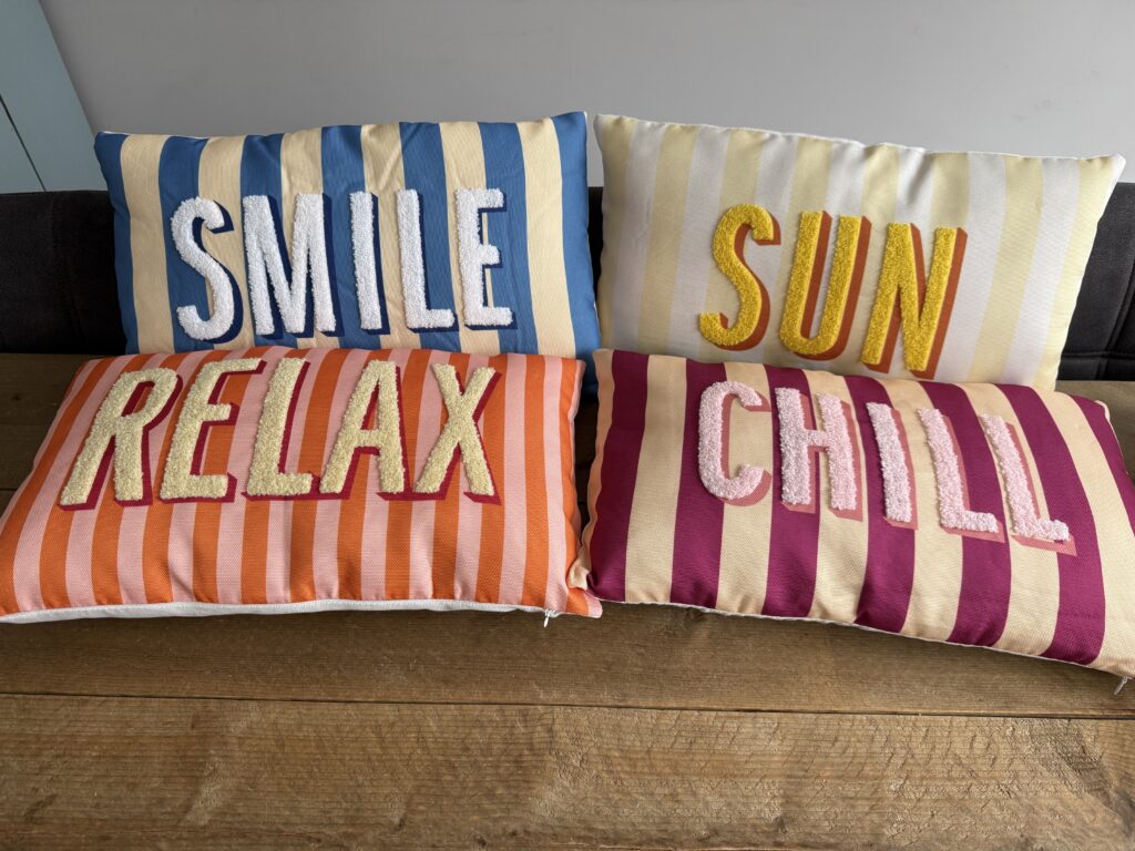 Bij mijn vriendin heb ik deze kussens gezien en hoewel ik ze ook al eerder bij de Action heb gezien en heb laten liggen, heb ik ze nu toch ook maar gekocht. Ze mogen mee naar de camping, waar de kleuren prima passen.
