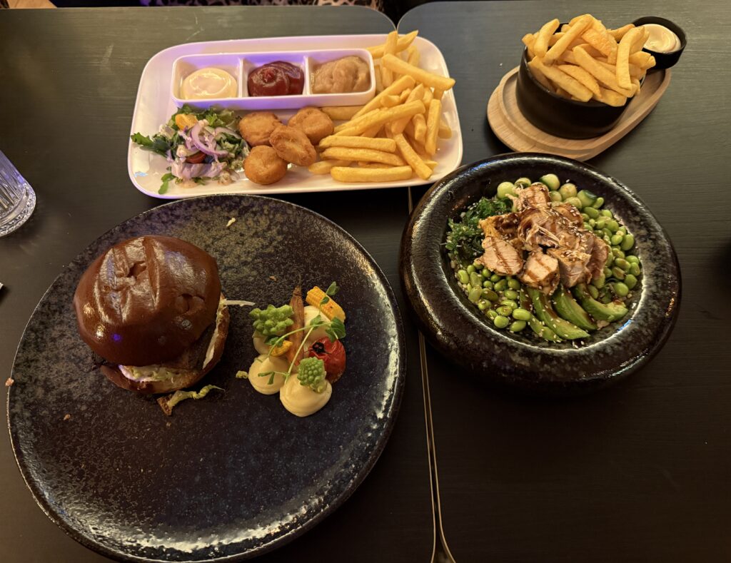 Ook het hoofdgerecht is superlekker. Kipnuggets voor mijn tiener, een poke bowl voor mijn puber en een brisket burger voor mij.
