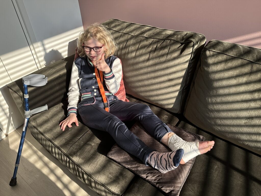 Mijn tuttebel mag vandaag voor het eerst naar de fysiotherapeut toe. Daar krijgen we te horen dat er geen scheurtje in haar enkelband zit, maar dat haar kuitbeenkopje zwaargekneusd is. Haar enkel wordt getaped en ze mag voorlopig nog helemaal niks.