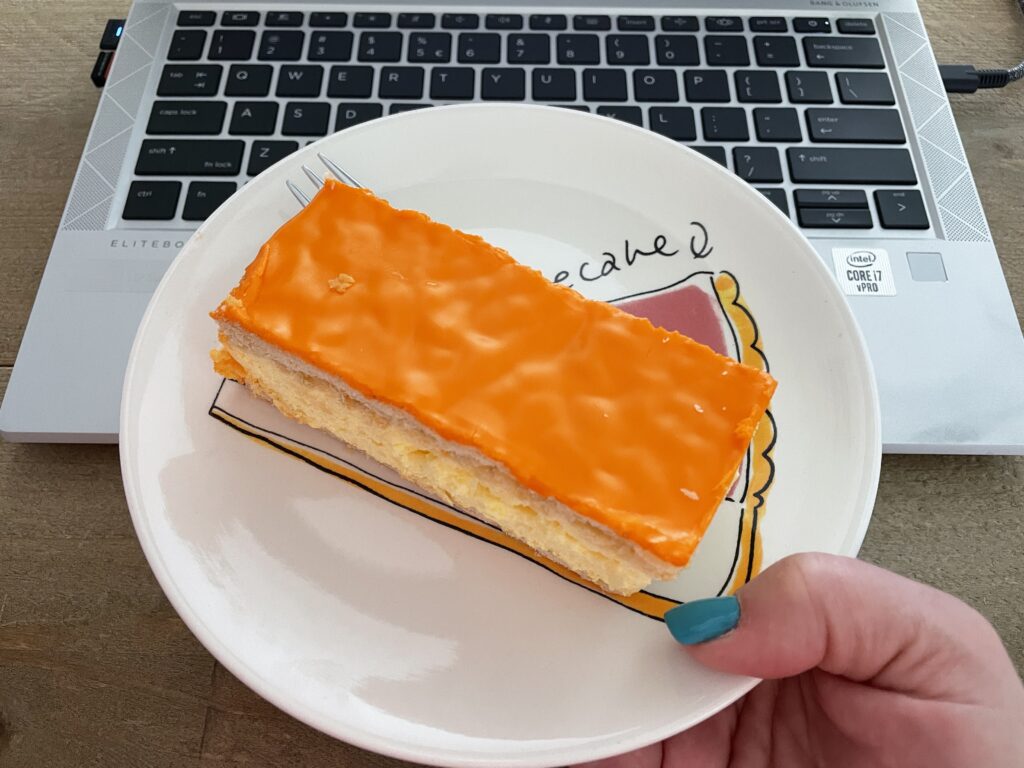 Zonder oranje tompouce geen Koningsdag, dus heeft de man wel lekker tompoucen gehaald, die ik maar wat graag op eet tijdens het werken.