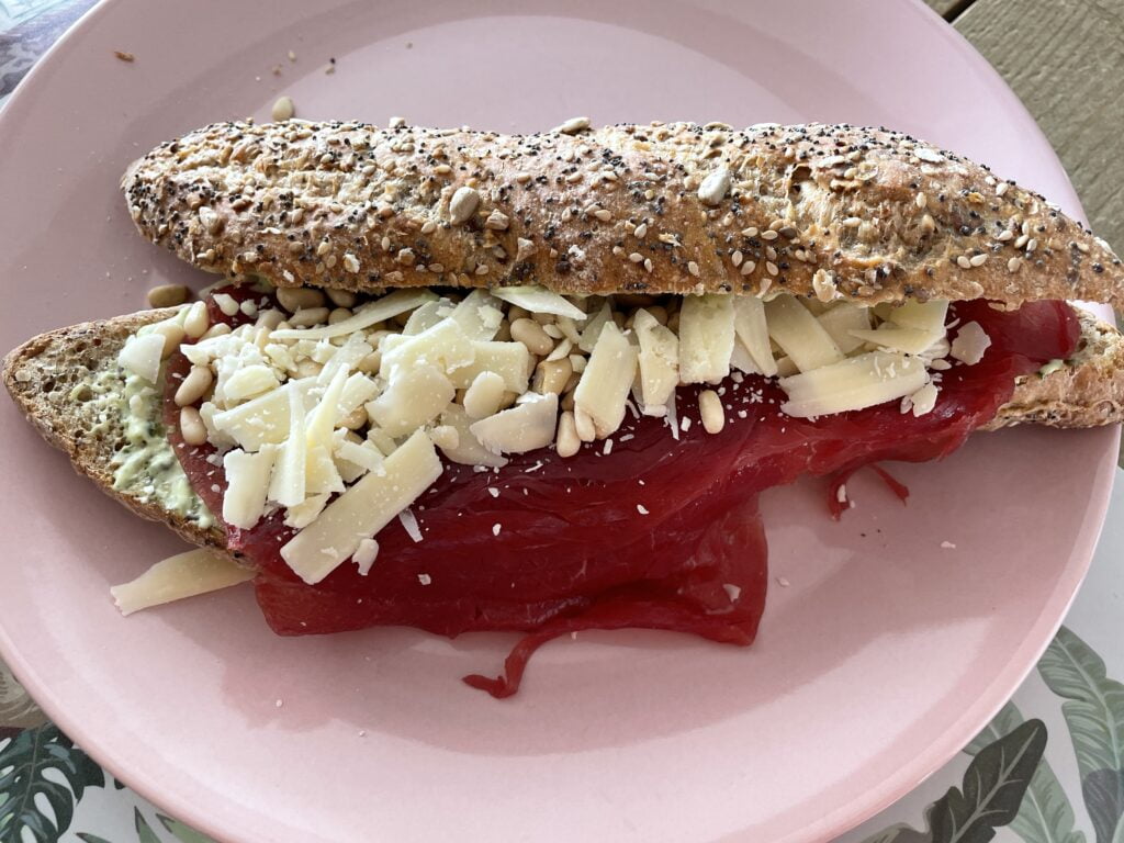 Ik word goed verzorgd, want de man maakt tussen de middag een broodje carpaccio voor me en ook daar zeg ik natuurlijk geen nee tegen.