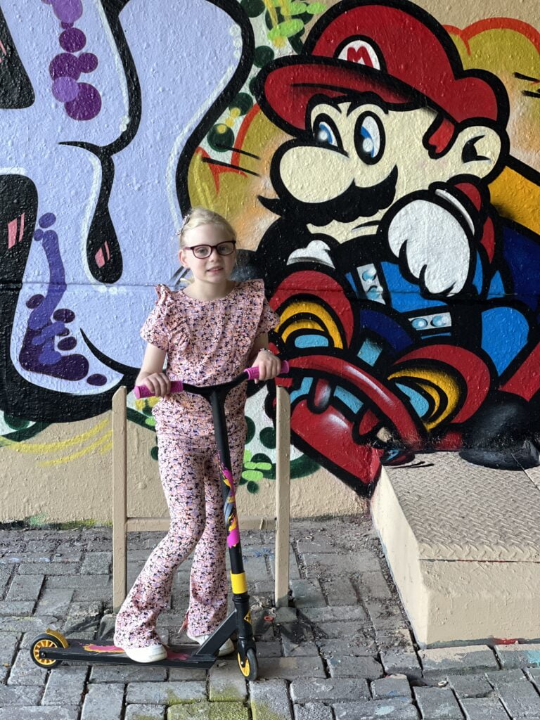 Aan het einde van de middag gaan we nog even een rondje lopen, want van al dat binnen zitten worden we geen van allen beter en het is buiten hartstikke lekker weer. Als we bij de graffiti viaduct komen maak ik een foto van mijn tuttebel met Mario.