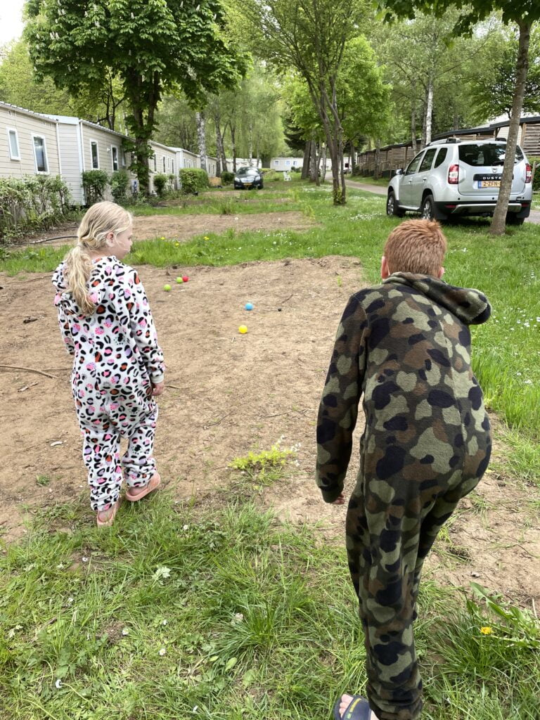 Als we even bij de kinderen willen kijken in het zwembad zijn ze net uitgezwommen. Bij de caravan kleden ze zich om en gaan samen een challenge aan van 10 minuten niksen en daarna samen een potje jeu de boules spelen.