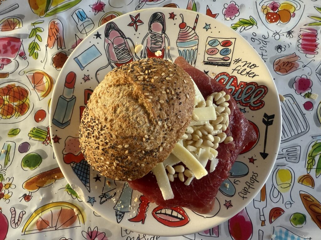 We eten vandaag makkelijk, want de carpaccio moet op. Zo blijven we ook nog heel even in vakantiemodus.