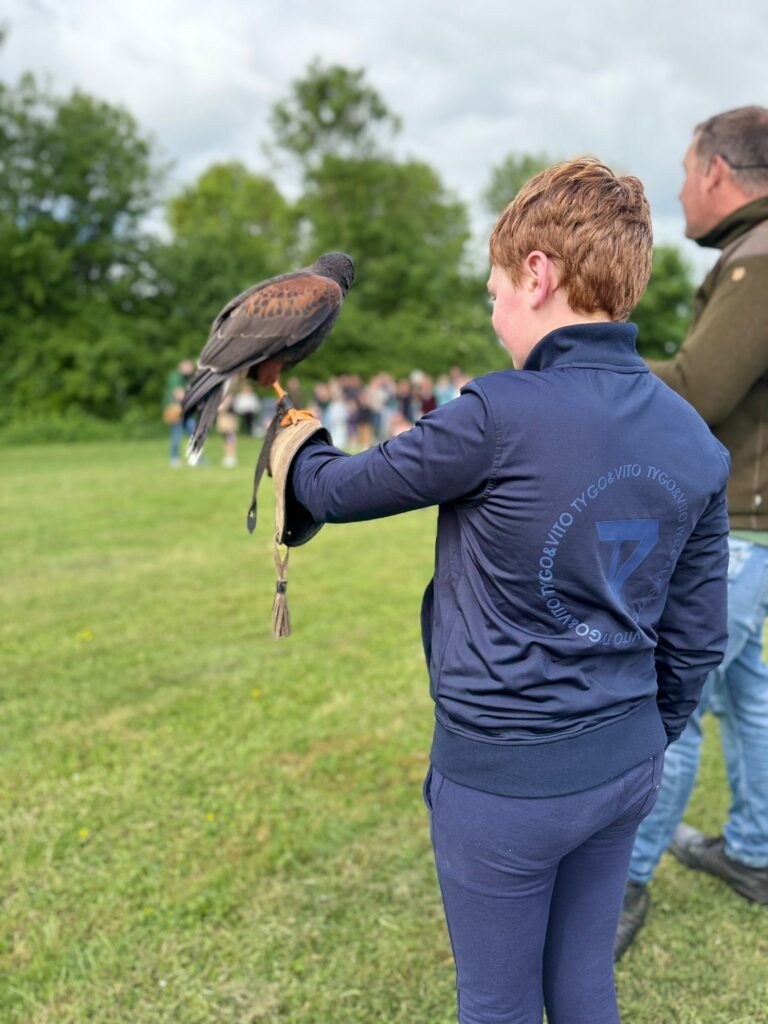 Er is blijkbaar een roofvogelshow, waar deze loedermoeder niet van op de hoogte is. Gelukkig heb ik lieve campingburen die foto’s maken van mijn puber, die één van de vogels vasthoudt.