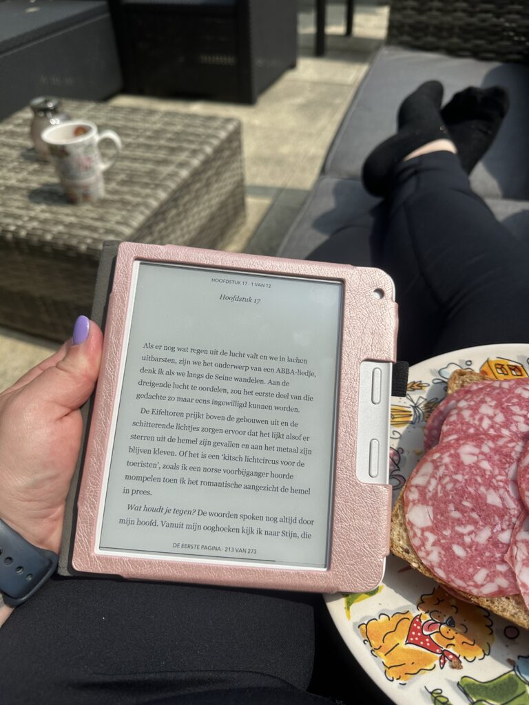 Het is heerlijk weer dus ga ik lekker in de tuin zitten om te lunchen, uiteraard wel met een boek erbij.