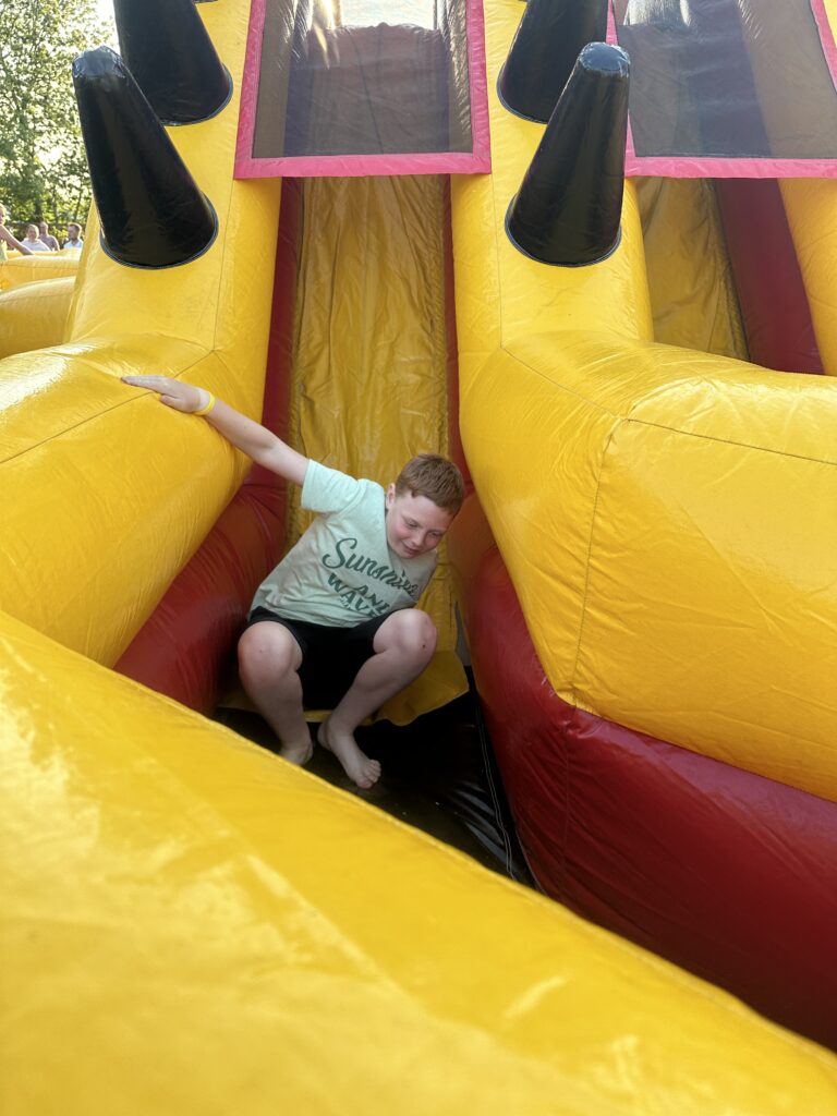 Er is vanavond een springkussenspektakel op de camping en de kinderen willen daar uiteraard naartoe. Helaas lijkt het minder leuk dan het klinkt, maar de kinderen vermaken zich.