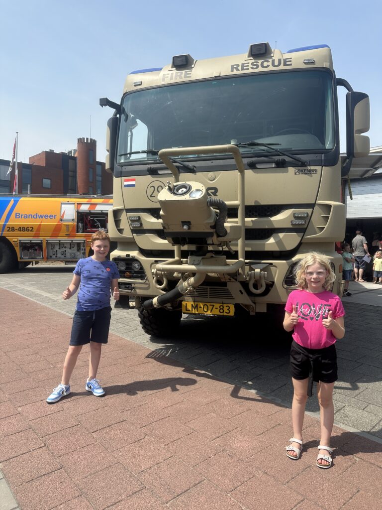 Na even snel wat gegeten te hebben gaan we samen met een vriendin en haar zoon richting de open dag van de brandweer in ons dorp. Hier vermaken de kinderen zich prima met alles wat met de brandweer te maken heeft, mogen ze in een ambulance en politieauto zitten en wordt mijn bink nog in de boeien geslagen door handhaving.