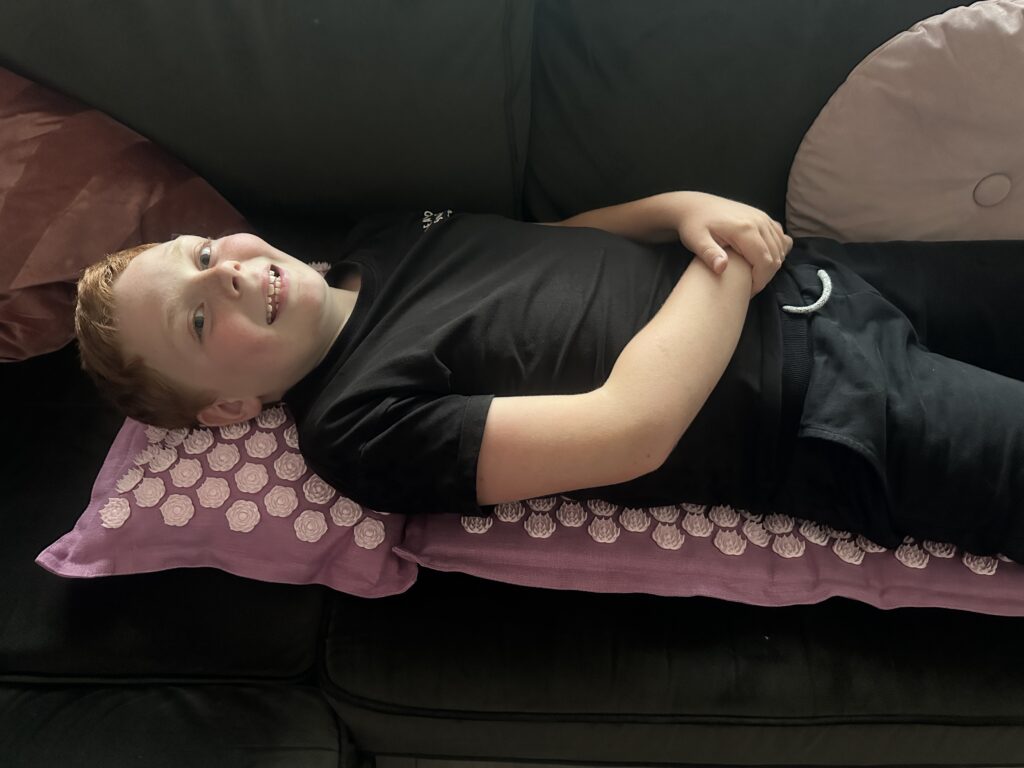 Speciaal voor de vermoeidheid heb ik de Pranamat tevoorschijn gehaald. Ik pak een voetmassage, maar de kinderen willen de grote mat ook eens uitproberen en vinden het eigenlijk best heel erg fijn.