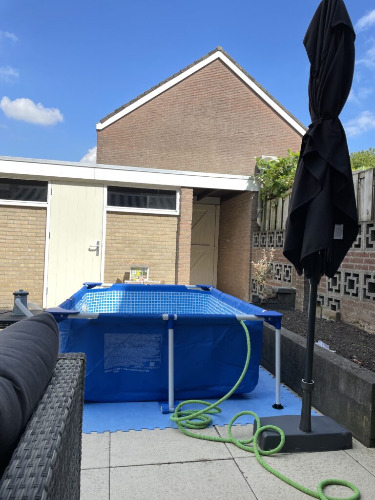 Van het sjouwen van de dozen heb ik het heel erg warm gekregen, dus duik ik samen met de kinderen lekker het zwembad in om af te koelen. De kinderen vermaken zich er nog een stuk langer in dan dat ik dat doe.
