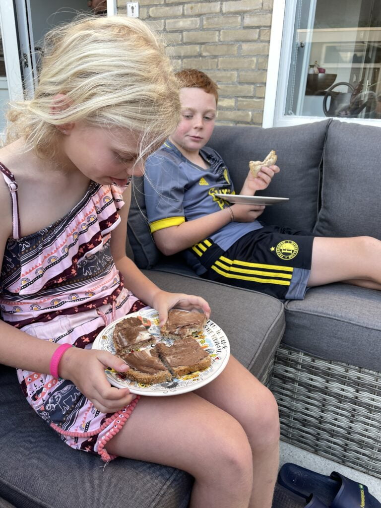 Vandaag zijn de kinderen en ik voor het eerst in lange tijd weer samen, terwijl ik wel gewoon aan het werk ben. We ontbijten gezellig met zijn drietjes buiten.