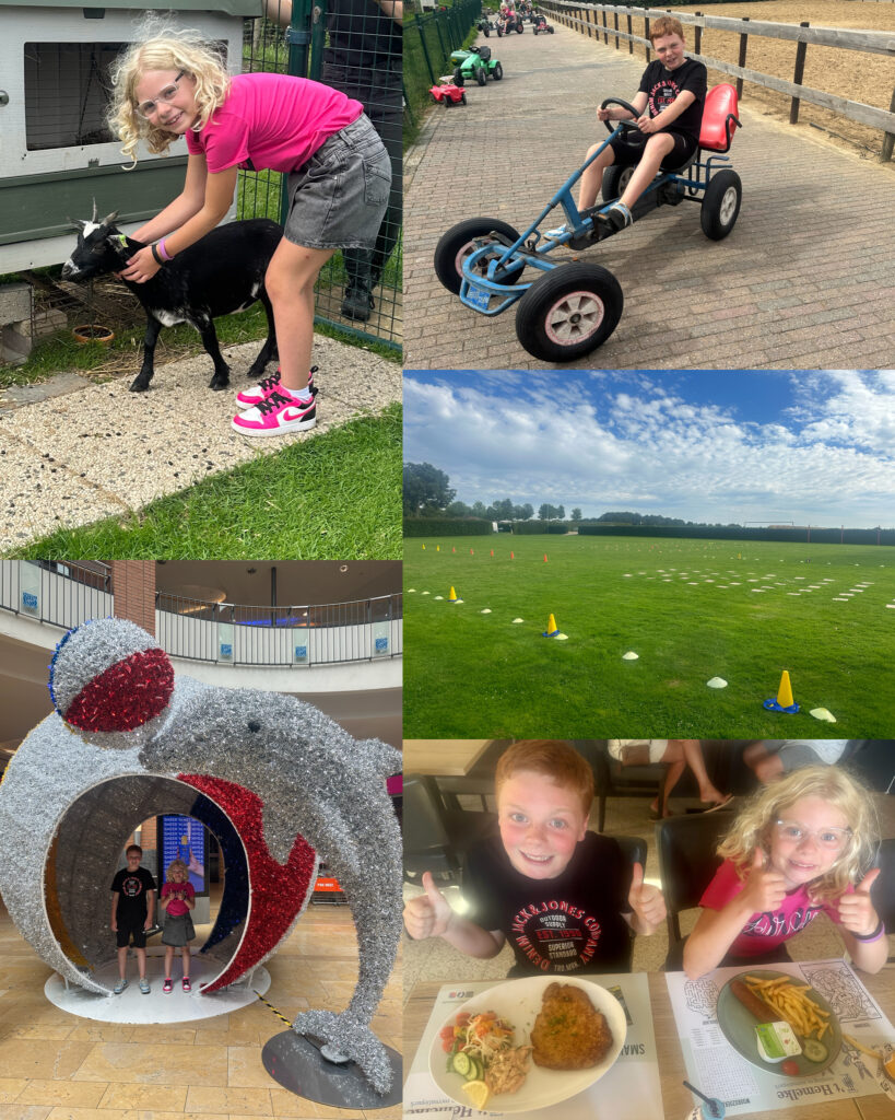 Aangezien ze gisteren graag naar de kinderboerderij wilden, heb ik er voor vandaag eentje gezocht die in de buurt is. Helaas voor ons is dit de tweede keer deze vakantie dat een uitje niet helemaal verloopt zoals gepland. Ik dacht dus dat ik een leuke kinderboerderij in de buurt had gevonden, zodat we daar heen konden gaan. Na het betalen van 12 euro entree, blijkt het meer speelboerderij te zijn dan kinderboerderij. We zijn nog net op tijd om het laatste stukje van het rondje langs de dieren mee te pikken, maar ook dat gaat eigenlijk nergens over. Kinderen mogen een beest aaien en dat is het. Voor de rest zitten de dieren achter gesloten hekken en mag je er niet bij. Is toch anders dan wat we gewend zijn. Enige wat ze nog leuk vinden zijn de skelters, maar na een halfuur staan we alweer buiten, omdat het verder wel echt heel saai is.