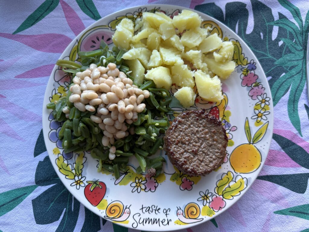 Voor het avondeten kook ik een aardappel met snijbonen, witte bonen en een hamburger. Het smaakt echt heerlijk.