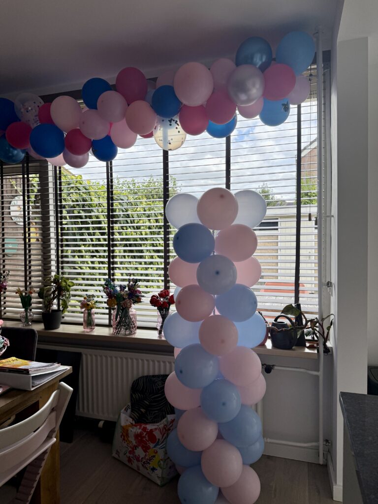 We vieren morgen het grote mensenfeest van mijn tiener en mijn lieve vriendin heeft een ballonnenslinger en een pilaar voor haar gemaakt.