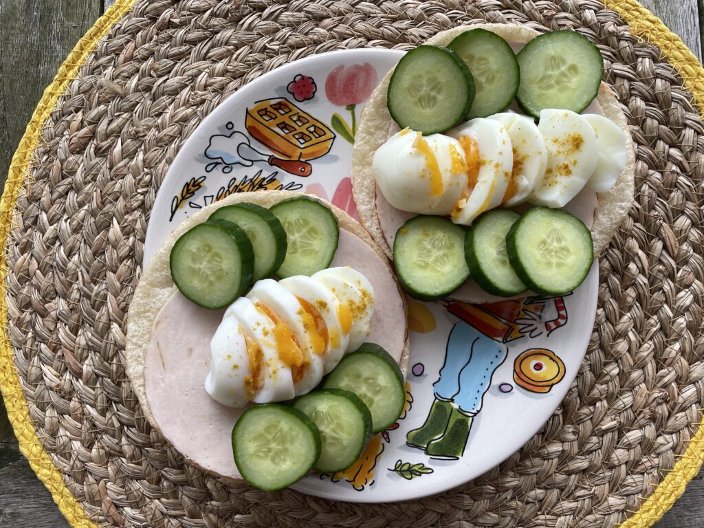 Tussen de middag eet ik lekker gepofte wafels met kipfilet, ei en komkommer. Een heerlijke combinatie.