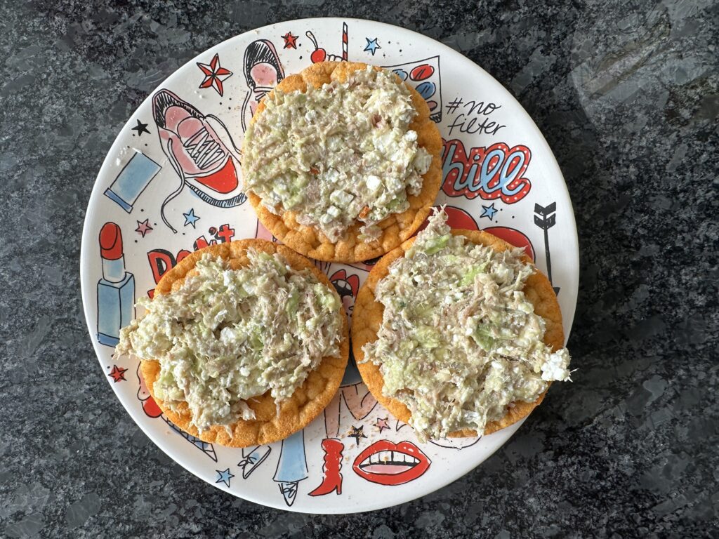 Ik trakteer mezelf op een heerlijke lunch bestaande uit paprika maiswafels met avocado, tonijn, feta en pijnboompitjes.