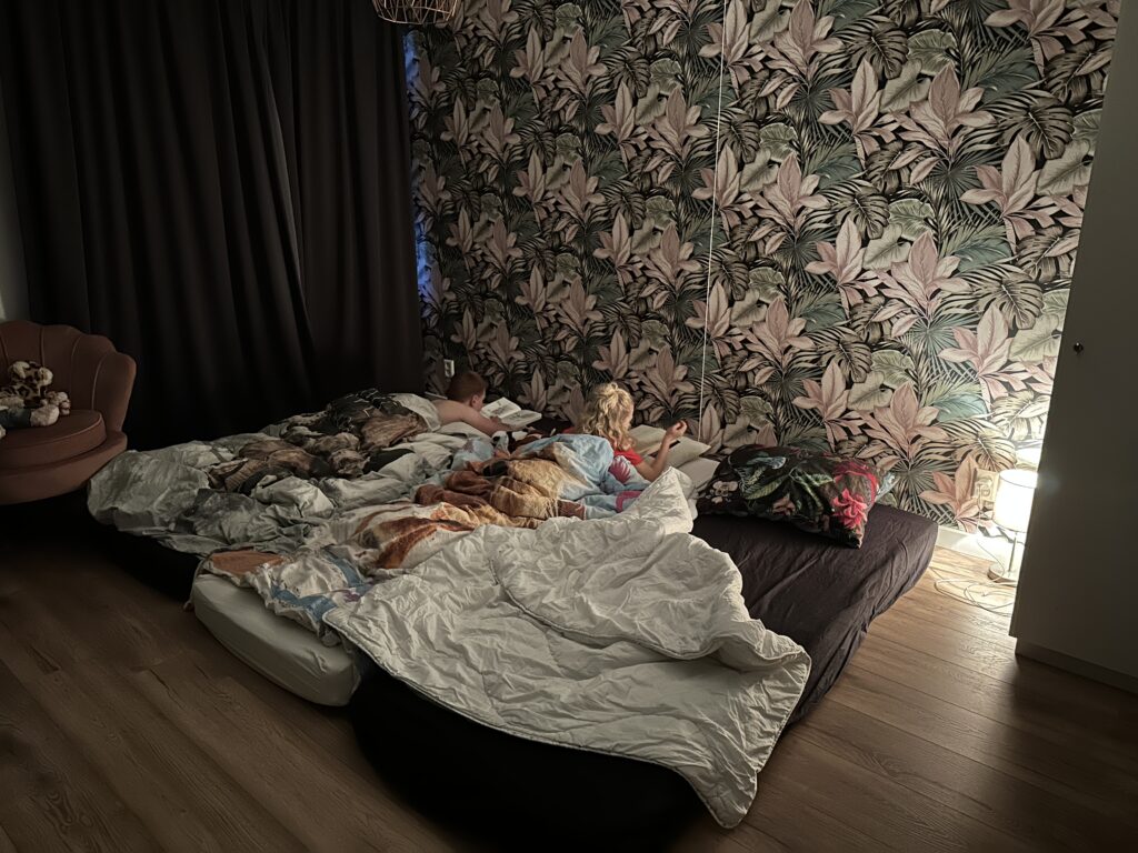Mijn bed is opgehaald en nu is mijn slaapkamer helemaal klaar voor mijn nieuwe bed. Nu het er zo leeg is besluit ik om de matrassen van de bedden van de kinderen te halen en slapen we met zijn drieën op mijn kamer.