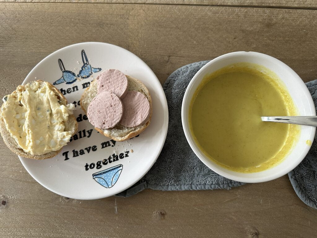Tussen de middag heb ik lekker een broodje met beleg en eet ik het restje prei kerrie soep van het weekend op. Wat echt heerlijk smaakt.