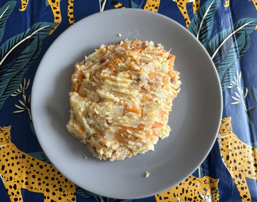 Als ik de kinderen vraag wat ze willen eten krijg ik als antwoord hutspot. Helaas voor hun ben ik de rookworst vergeten te kopen, dus blijft het bij spekjes door de hutspot.