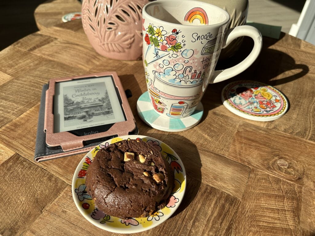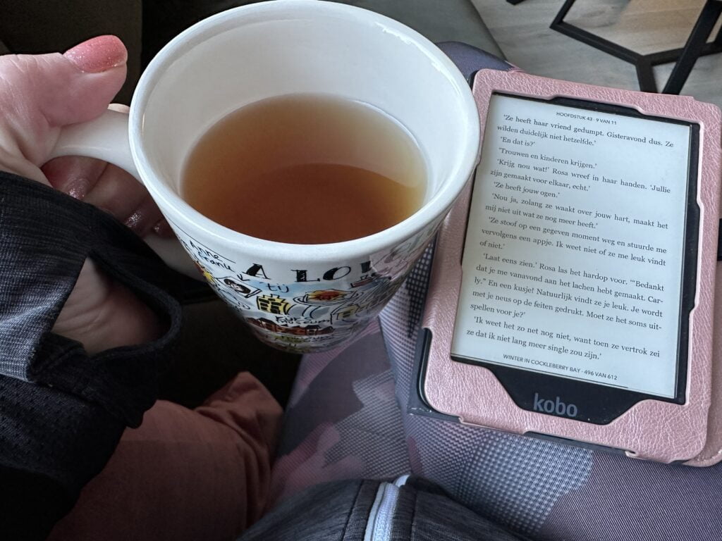 Aangezien ik vanmiddag geen zin had om te moeten stressen of ik wel genoeg uren zou maken met werken, heb ik vanmiddag vrij genomen. Even helemaal niks is ook wel echt heel erg nodig. Het is best zwaar om heel veel alleen te moeten doen, omdat de man er te ziek voor is of er simpelweg geen energie voor heeft. Ik trakteer mezelf op thee, mijn boek en koek.