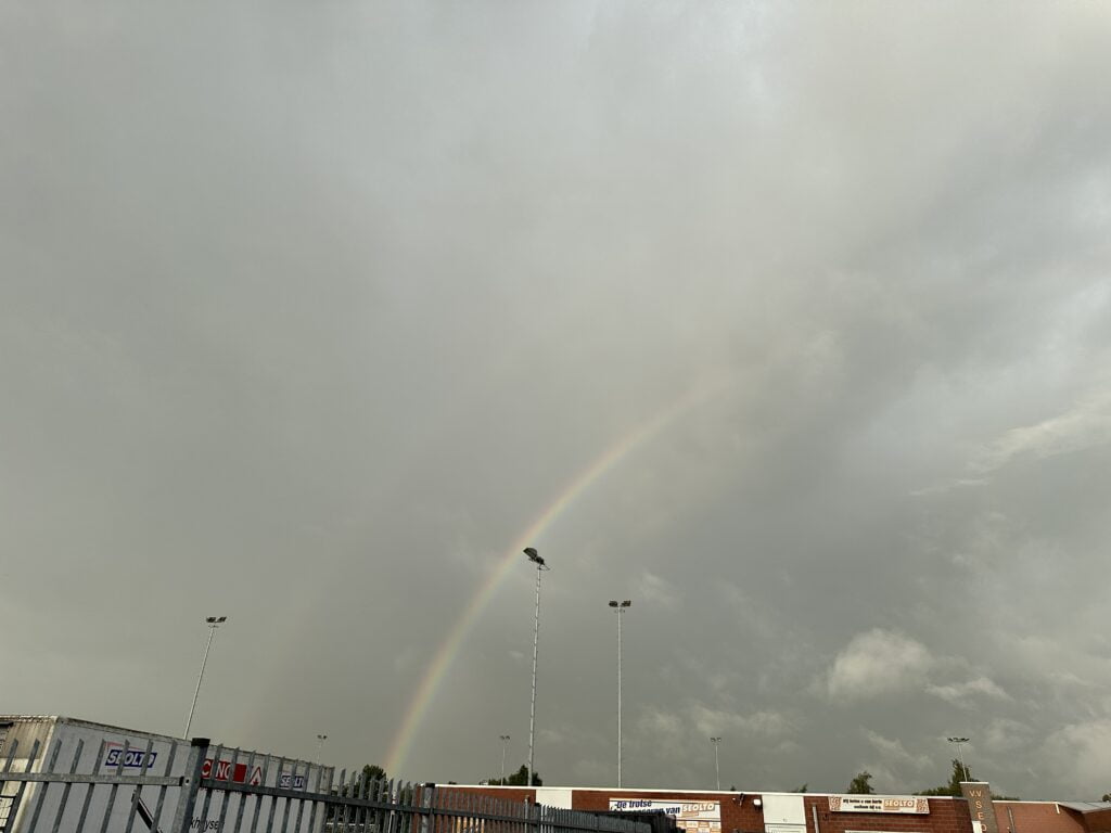Als ik het voetbalterrein op rijd met mijn tuttebel zien we een regenboog. Helaas voor ons voorspelt dat niet zoveel goeds, want nog geen vijf minuten later komt het met bakken uit de hemel. Arm kind, want ze moet wel gewoon voetballen. Wat ze overigens alleen de laatste 10 minuten doet, want ze heeft er geen zin in. Fijn ook wel als je daar als moeder met je goede gedrag langs de kant staat. Gelukkig komt haar vader nog heel even kijken als hij mijn bink afzet voor zijn wedstrijd en die weet haar over te halen toch te gaan voetballen.