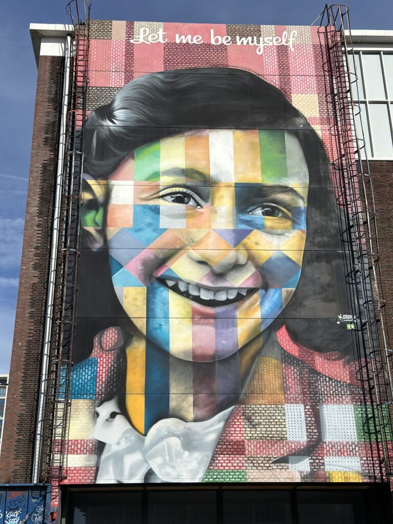 Daarna wandelen we nog naar de NDSM werf toe. Eigenlijk wil ik de Straat in, maar om daar te kunnen fotograferen moet ik ook nog eens twintig euro betalen dus laat ik het maar bij deze mooie plaat van Anne Frank.