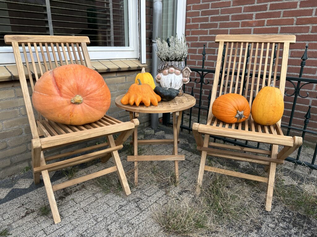 Sinds ik bezig ben met het Halloween thema wil ik al een hoekje maken buiten. Op de terugweg van mijn werk heb ik op de dijk bij boerderijen pompoenen gekocht. Ik ben echt blij met het hoekje, ondanks het onkruid wat er onder groeit, maar volgens mijn tuttebel maakt dat het wat enger tijdens de Halloween optocht, dus mag ik het niet weg halen.